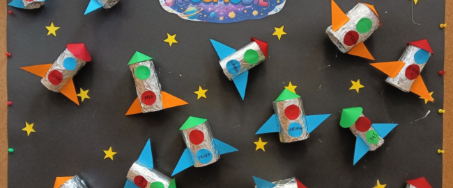 W ostatnim tygodniu dużo rozmawialiśmy o kosmosie, gwiazdach i planetach, a zdobytą wiedzę wykorzystaliśmy tworząc wspólny plakat z rakietami .