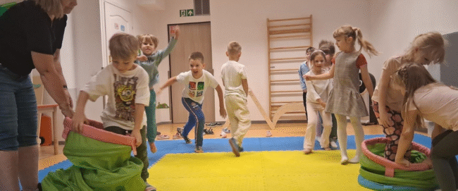 Przedszkole jest w szczęśliwym posiadaniu dużej sali gimnastycznej. Spełnia ona wiele funkcji oprócz podstawowej – gimnastycznej. W naszej sali prowadzimy także warsztaty plastyczne, zajęcia z judo, zajęcia taneczne, mają tam miejsce przedstawienia teatralne oraz wiele innych aktywności .