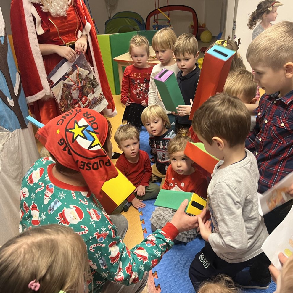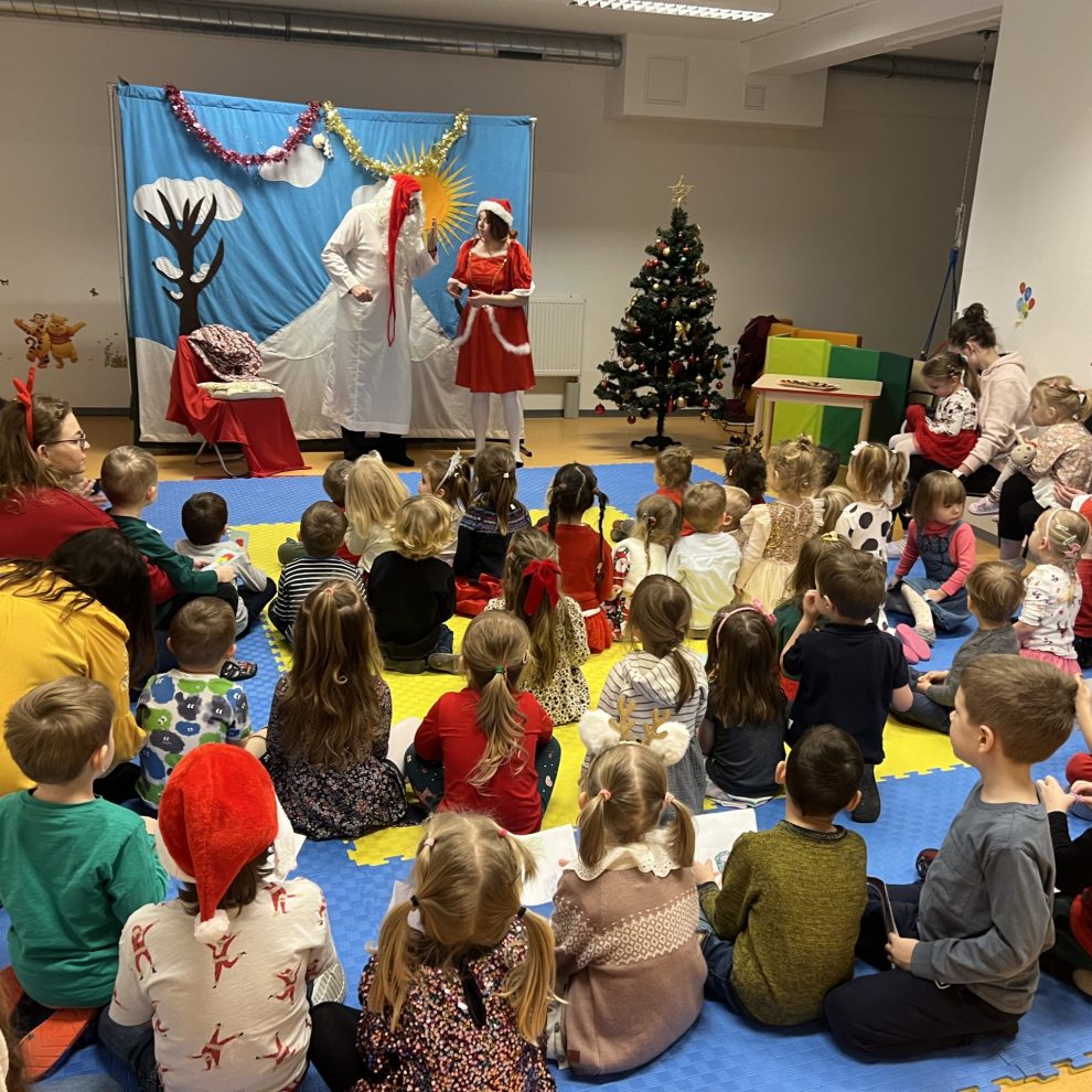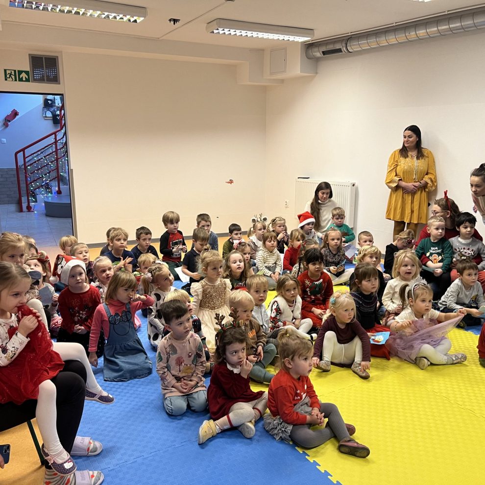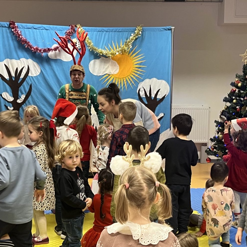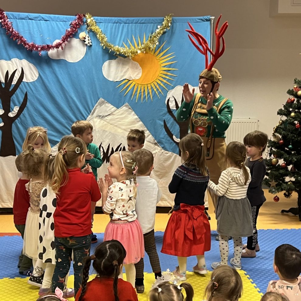 Dziś w Ważce świętowaliśmy dzień Świętego Mikołaja . Na tę uroczystość zaprosiliśmy ulubiony przez nasze dzieci Teatr Elefant z przedstawieniem „Prezent dla Św.Mikołaja”. Bajka była interaktywna. Dzieci brały udział w przedstawieniu, współtworzyły choreografię do piosenek, odpowiadały na pytania zdawane przez aktorów . Wszystkie maluchy były bardzo zaangażowane i mocno przeżywały swoje role. W bajce brało udział 3 aktorów, którzy wcielili się w pięć postaci . Spektakl miał bogatą dekorację, kolorowe kostiumy i piosenki związane okresem bożonarodzeniowym. Po przedstawieniu Św. Mikołaj wręczył każdemu dziecku prezent. Dzieci z kolei przygotowały piękny program artystyczny dla Mikołaja w podziękowaniu za prezenty i przyjazd . W Ważce ,jak zwykle w Święta , uroczyście, wesoło i kolorowo .