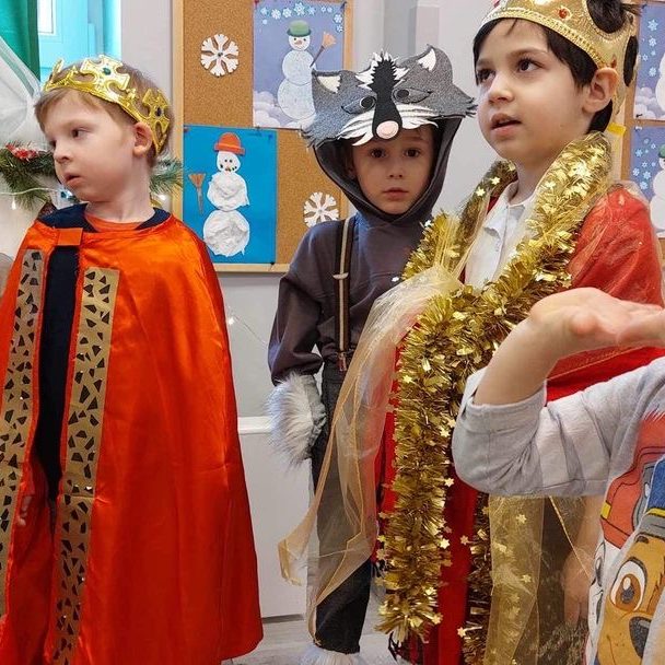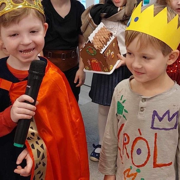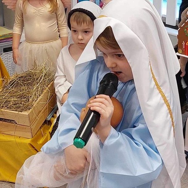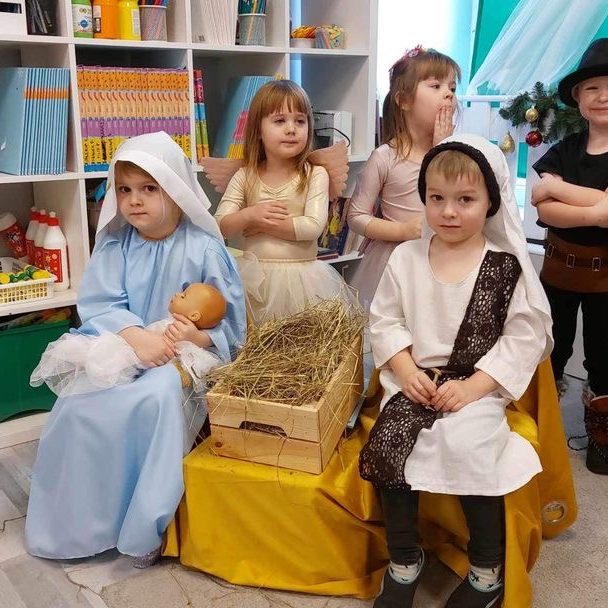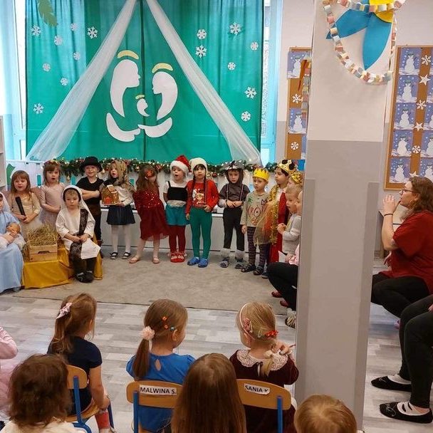 Wspaniałe chwile przeszłości ożywają w naszej pamięci, gdyż przedszkolne kolorowe światło wypełniło salę podczas niezapomnianego przedstawienia – „Nasze Jasełka”. Dzieci, pełne entuzjazmu, wcieliły się w role bożonarodzeniowych postaci, a ich uśmiechy zdobiły scenę jak gwiazdy na niebie. Drodzy Rodzice, wspomnijcie te magiczne chwile, kiedy serca waszych maluchów zagrały w rytm świątecznej magii. Pasterze, aniołki, i maleńki Jezus w koronie chwały złożyli wam niezapomniane podziękowanie za wsparcie i uśmiech na twarzy. Po spektaklu, zanurzyliśmy się w czasie kolędowania, tworząc wspólne, ciepłe wspomnienia. Dziękujemy, że byliście z nami, dziękujemy za te chwile, które pozostaną w naszych sercach jak iskierki świątecznej radości.