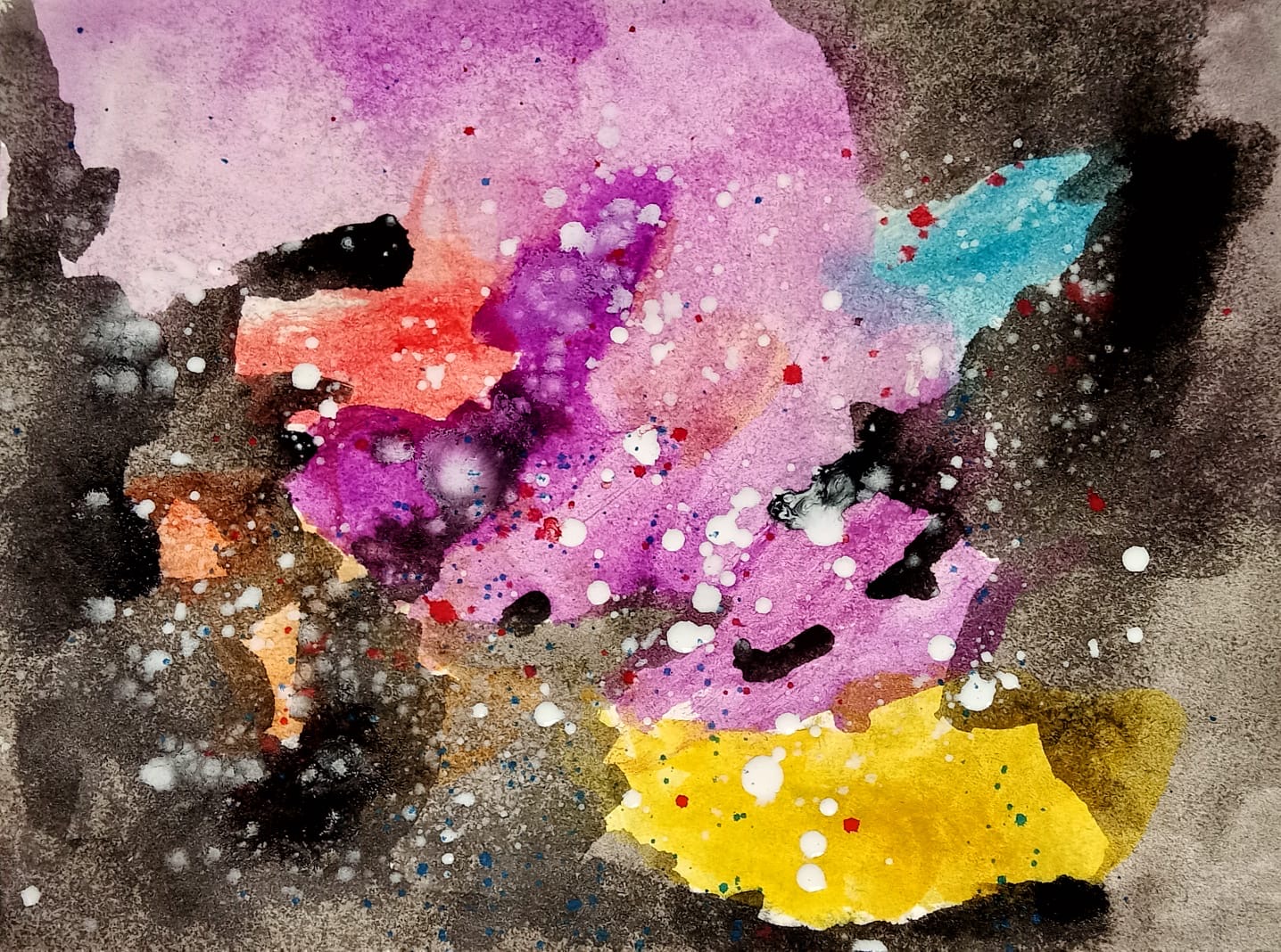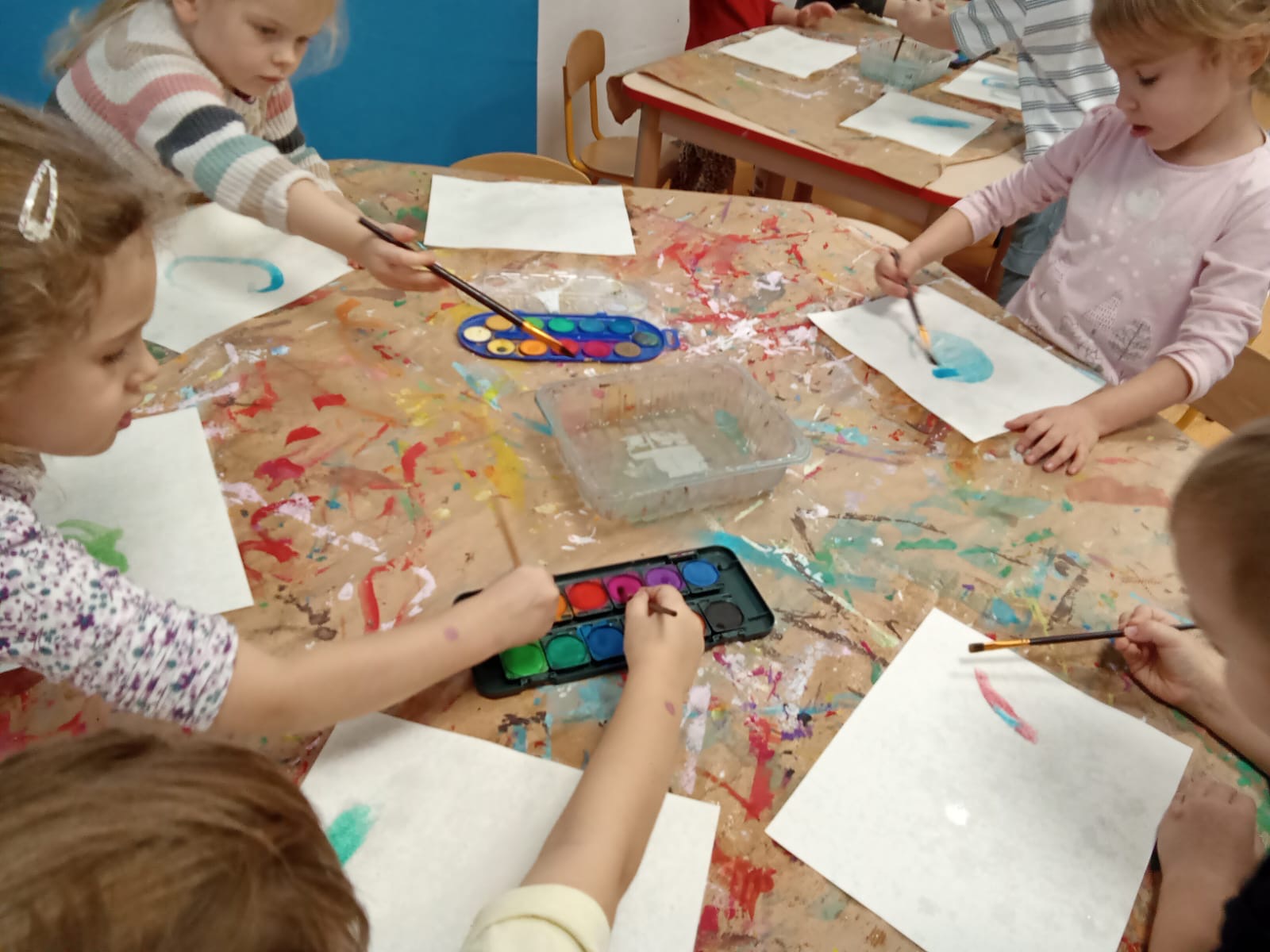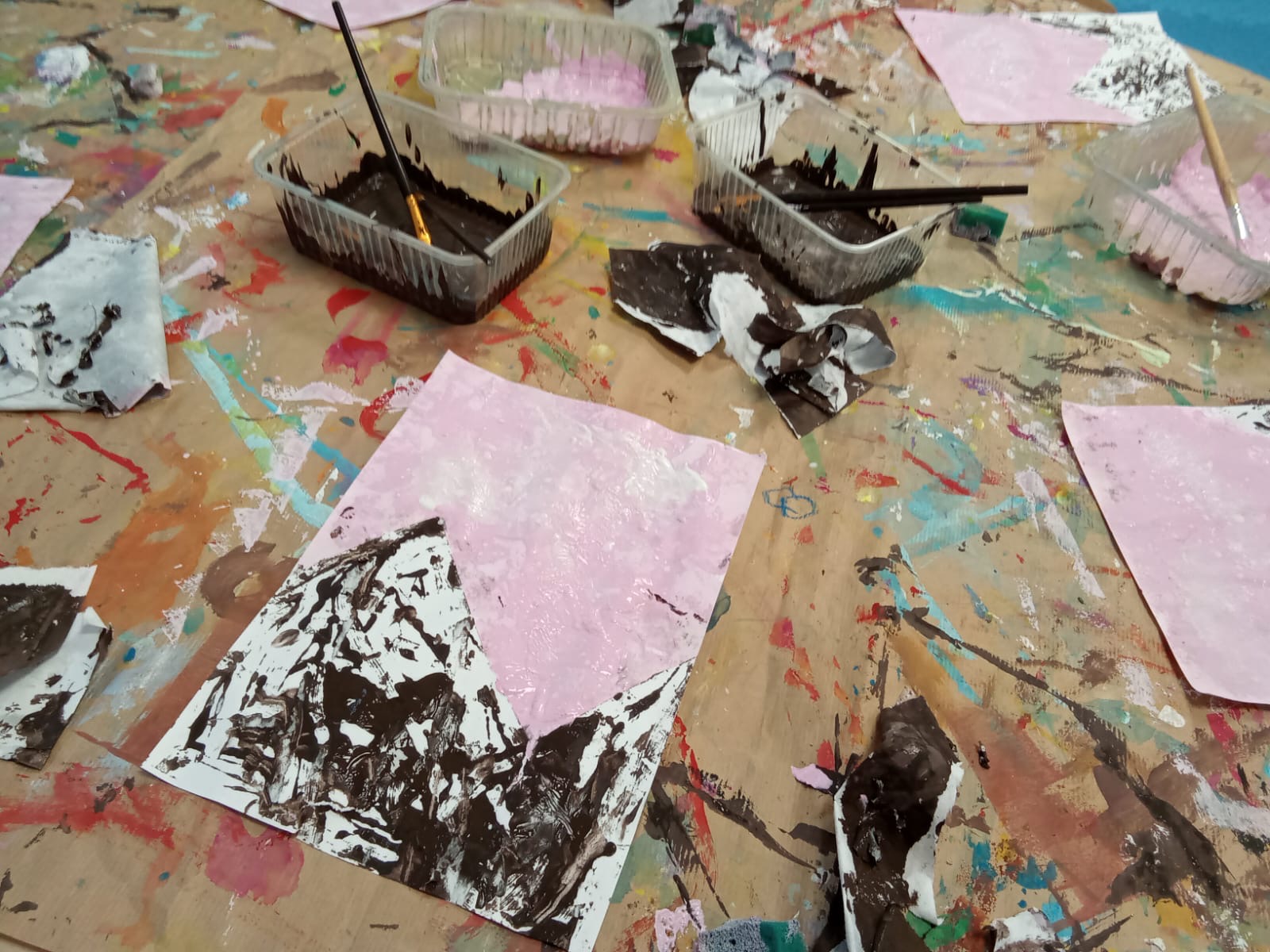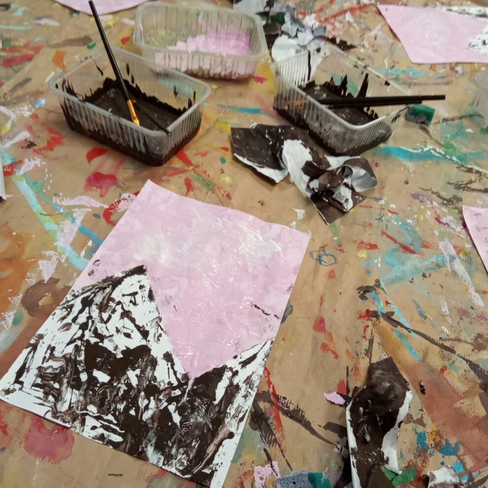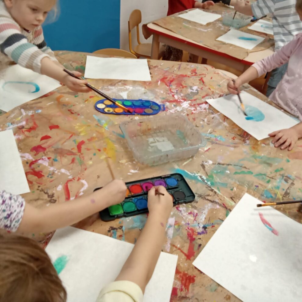 Dzisiaj pracowaliśmy w różnych technikach. Młodsze dzieci zainspirowane zdjęciami z kosmosu wykonały akwarele na papierze przedstawiające mgławice, starsze zaś wykonały ośnieżone góry za pomocą techniki odbijania z użyciem papieru , gąbek i tempery .