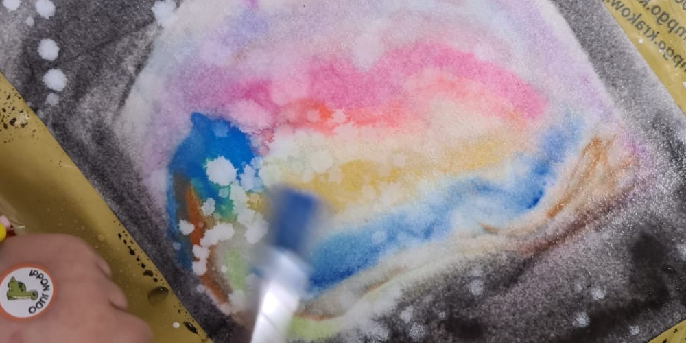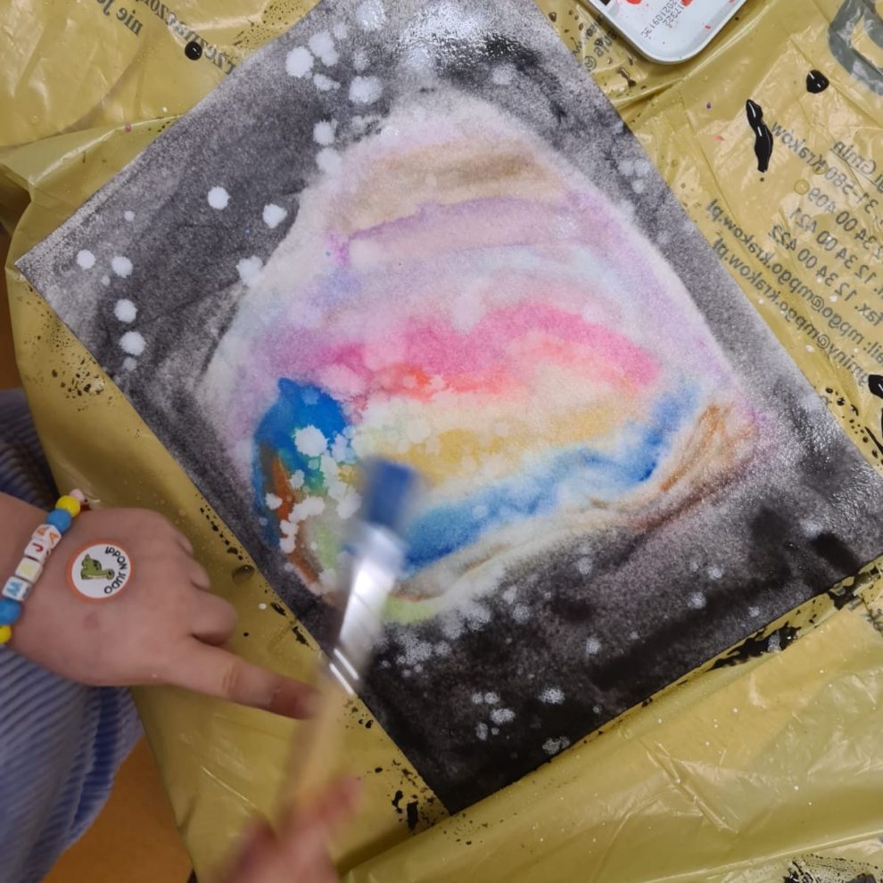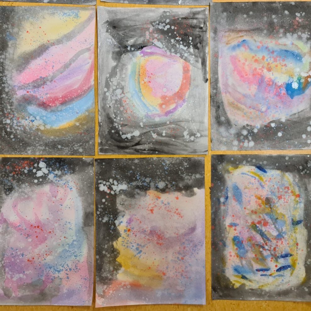 Jako przedszkole artystyczno językowe przykładamy dużą wagę do działań artystycznych . Malujemy, rysujemy, robimy kolaże, wycinanki i wszystko co rozwija nasz zmysł artystyczny . Dziś przenieśliśmy się w kosmos i malowaliśmy mgławice, techniką mokre na mokre, na papierze akwarelowym. Efekty zaskakująco piękne .
