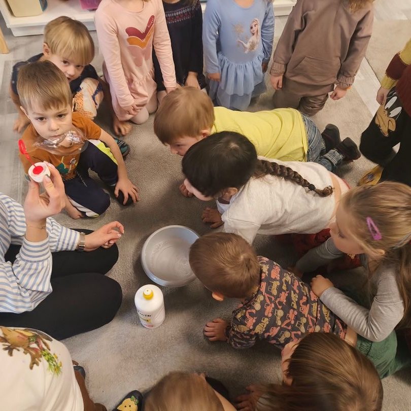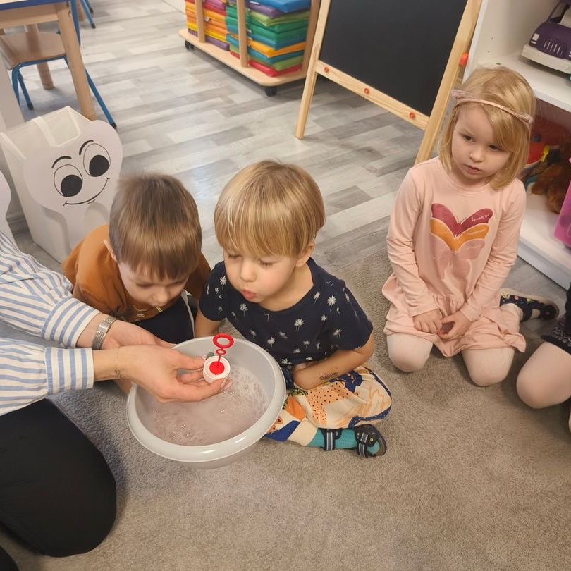Dziś łączymy super zabawę z nauką, informacjami o higienie naszych ząbków oraz puszczaniem baniek . Jest wesoło
