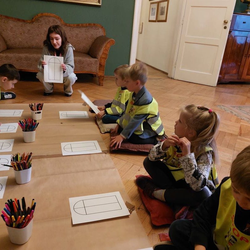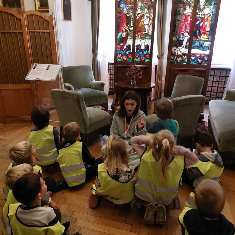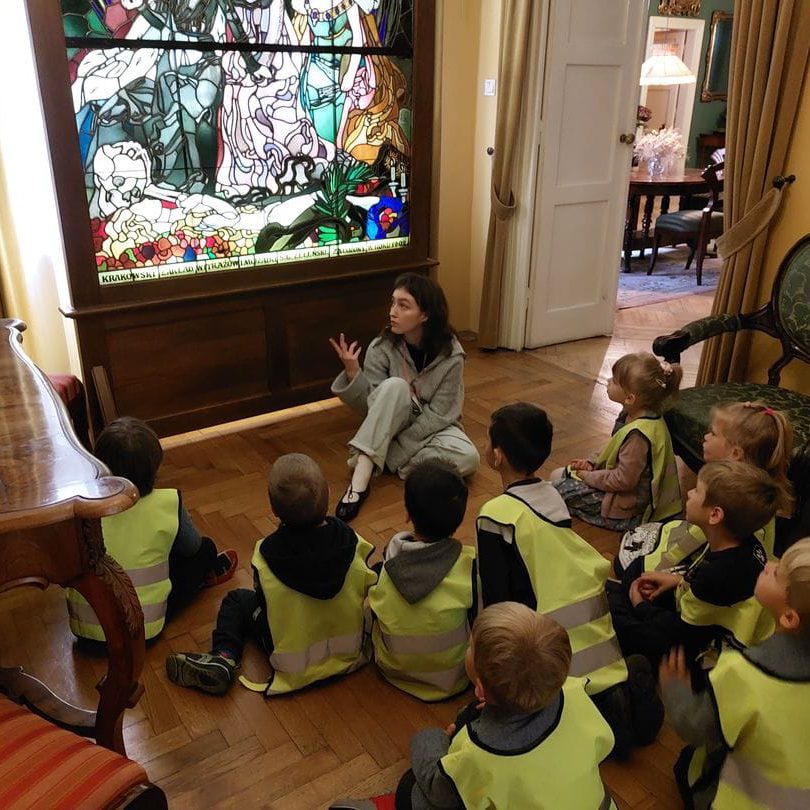 Dzieci wzięły udział w lekcji o witrażach prowadzonej przez Panią z Działu Edukacji, a także podziwiały obrazy , meble oraz piękny ogród.