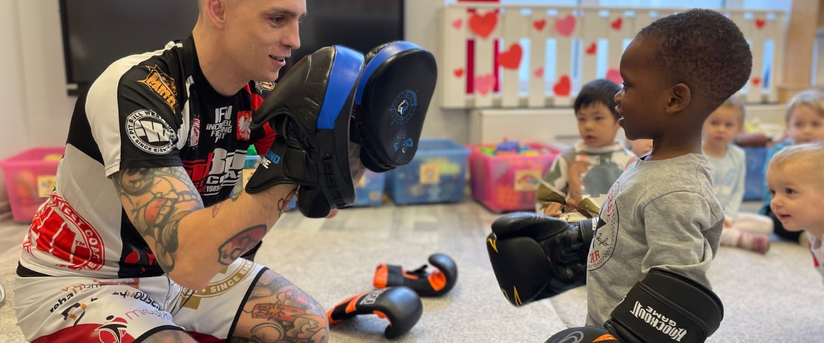 W ramach poznawania różnych zawodów mieliśmy przyjemność gościć dziś tatę jednego z naszych podopiecznych, który opowiedział nam o swoim zawodzie trenera. Maluchy przymierzały rękawice i ochraniacze oraz zadawały nieskończoną ilość pytań .