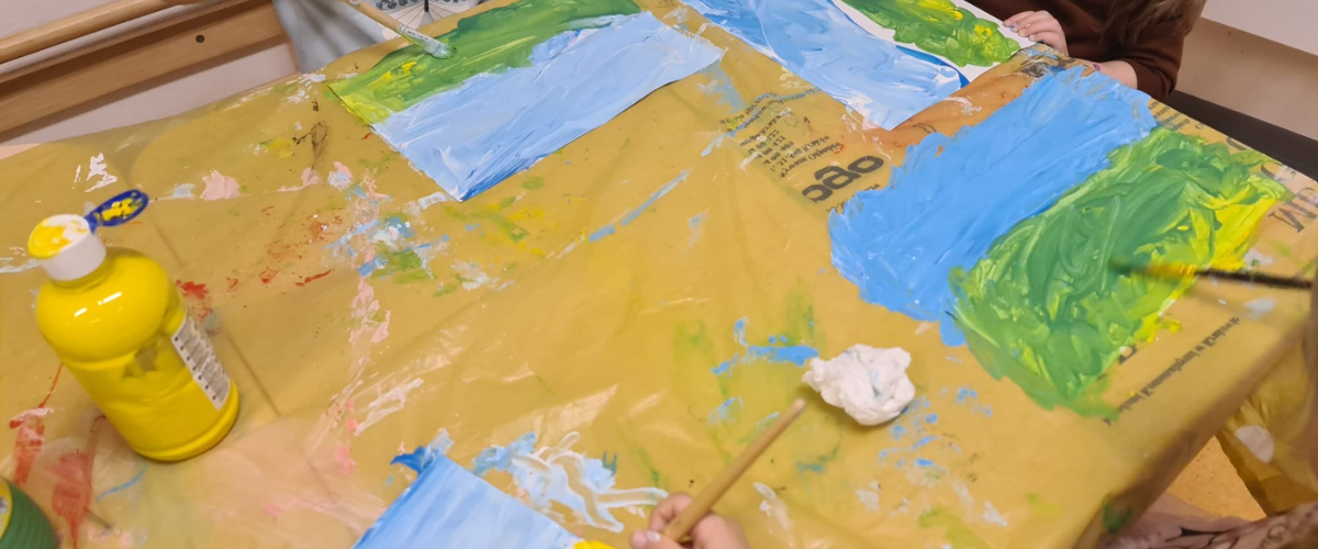 Na dzisiejszych zajęciach dzieci malowały drzewa rzucające cienie w technice tempery, młodsze zaś tworzyły prace warstwowe.